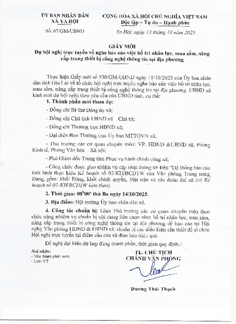 Giấy mời Dự hội nghị trực tuyến về nghe báo cáo việc bố trí nhân lực, mua sắm, nâng cấp trang thiết bị công nghệ thông tin tại địa phương 13/10/2025, 10:03:22 - Lượt xem: 0 Tweet Thêm vào danh sách Báo xấu Thông tin tài liệu Giấy mời Dự hội nghị trực tuyến về nghe báo cáo việc bố trí nhân lực, mua sắm, nâng cấp trang thiết bị công nghệ thông tin tại địa phương