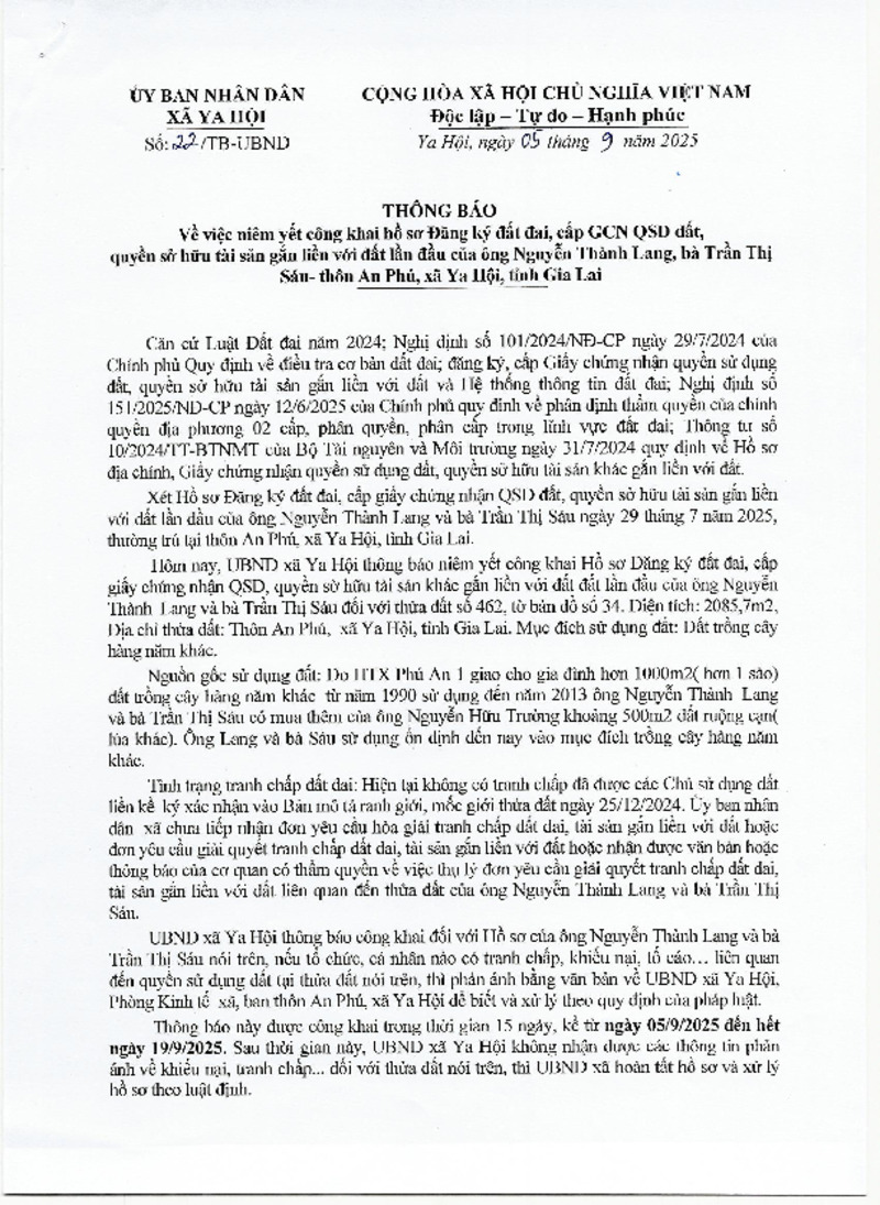 Niêm yết công khai hồ sơ đăng ký đất đai, cấp GCN QSD đất, quyền sở hữu tài sản gắn liền với đất lần đầu của ông Nguyễn Thành Lang, bà Trần Thị Sáu - thôn An Phú, xã Ya Hội, tỉnh Gia Lai