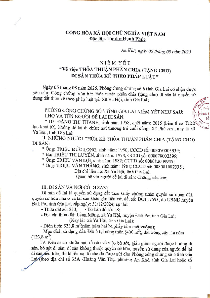Niêm yết về việc thỏa thuận phân chia (tặng cho) di sản thừa kế theo pháp luật của bà Đặng Thị Thanh 05/08/2025, 14:39:21 - Lượt xem: 2 Tweet Thêm vào danh sách Báo xấu Thông tin tài liệu Niêm yết về việc thỏa thuận phân chia (tặng cho) di sản thừa kế theo pháp luật của bà Đặng Thị Thanh