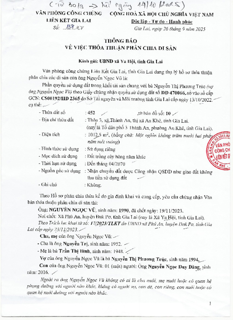 Thông báo về việc thỏa thuận phân chia di sản của ông Nguyễn Ngọc Vũ 30/09/2025, 16:33:12 - Lượt xem: 5 Tweet Thêm vào danh sách Báo xấu Thông tin tài liệu Thông báo về việc thỏa thuận phân chia di sản của ông Nguyễn Ngọc Vũ