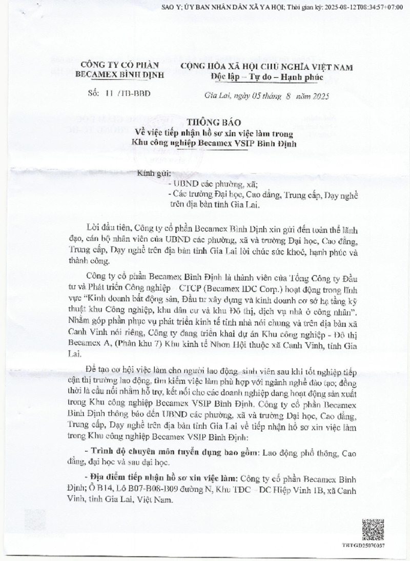Thông báo về việc tiếp nhận hồ sơ xin việc làm trong khu công nghiệp Becamex VSIP Bình Định 23/09/2025, 07:45:26 - Lượt xem: 4 Tweet Thêm vào danh sách Báo xấu Thông tin tài liệu Thông báo về việc tiếp nhận hồ sơ xin việc làm trong khu công nghiệp Becamex VSIP Bình Định