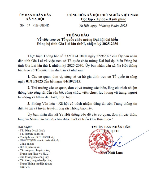 UBND xã Ya Hội ban hành Thông báo số 33/TB-UBND ngày 24/9/2025 về việc treo cờ Tổ quốc chào mừng Đại hội đại biểu Đảng bộ tỉnh Gia Lai lần thứ I, nhiệm kỳ 2025-2030, cụ thể như sau: