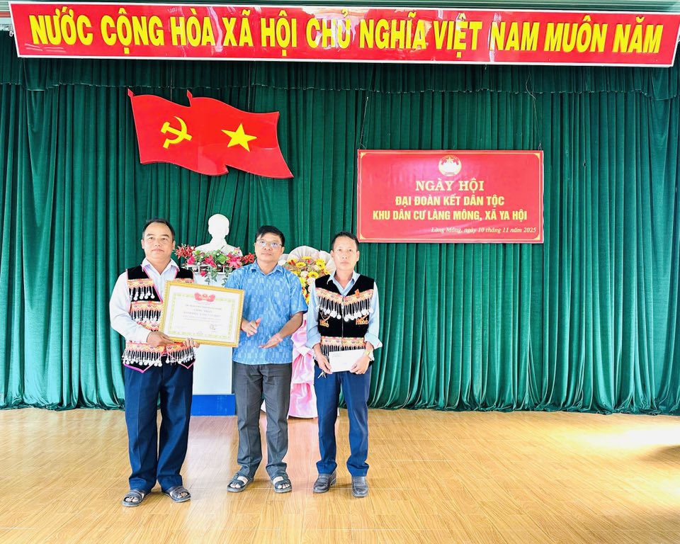 Nhân dịp Ngày hội, lãnh đạo UBND xã Ya Hội trao danh hiệu " Làng văn hóa năm 2025" cho tập thể nhân dân làng Mông. Lãnh đạo Ủy ban MTTQVN xã tặng giấy khen cho 2 cá nhân thực hiện tốt phong trào thi đua và đại diện Nhà máy đường An Khê trao tặng 3 suất quà cho các gia đình khó khăn của làng Mông.
